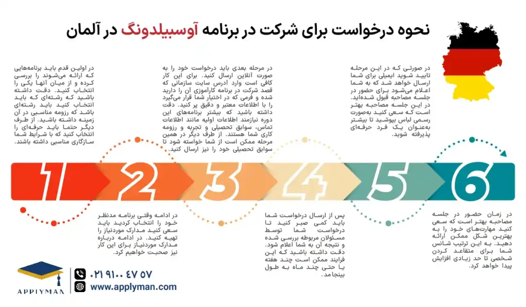 به منظور شرکت در برنامه آوسبیلدونگ آلمان شما باید چند مرحله خاص را طی کنید. در ادامه توضیحاتی را درباره این مراحل در اختیار شما قرار خواهیم داد.